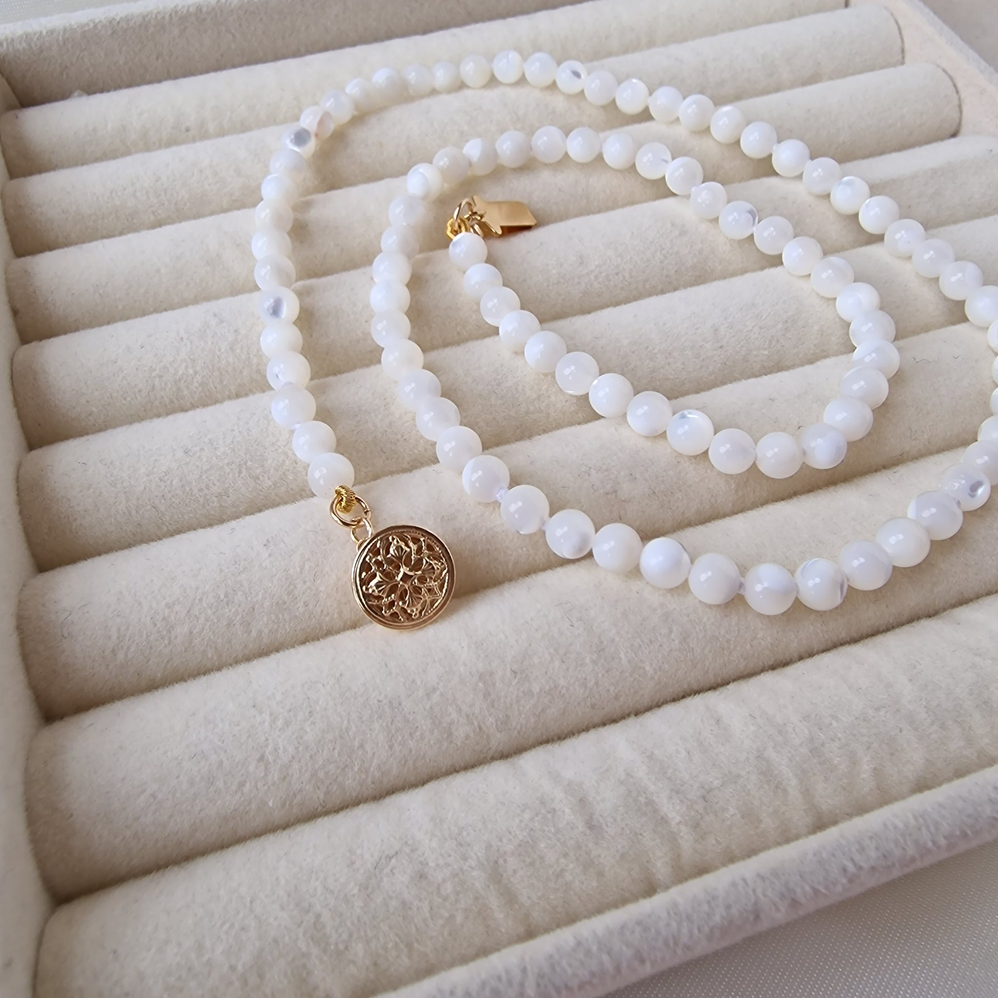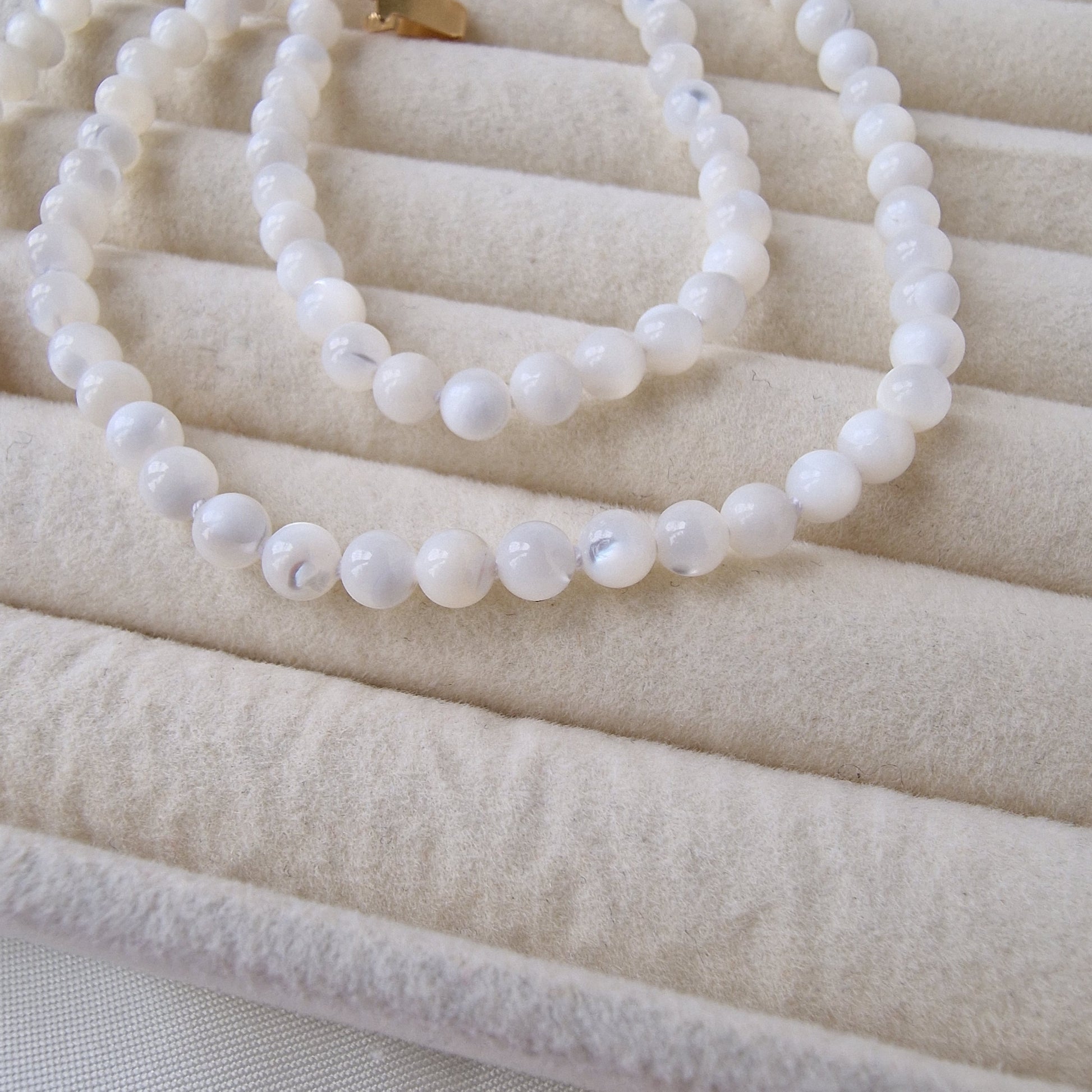 The Perla Necklace is one of those pieces that makes any outfit look a little more polished without trying too hard. I made it using smooth mother-of-pearl beads paired with a gold-filled clasp, so it has that clean, elegant look while still being durable enough for everyday wear.