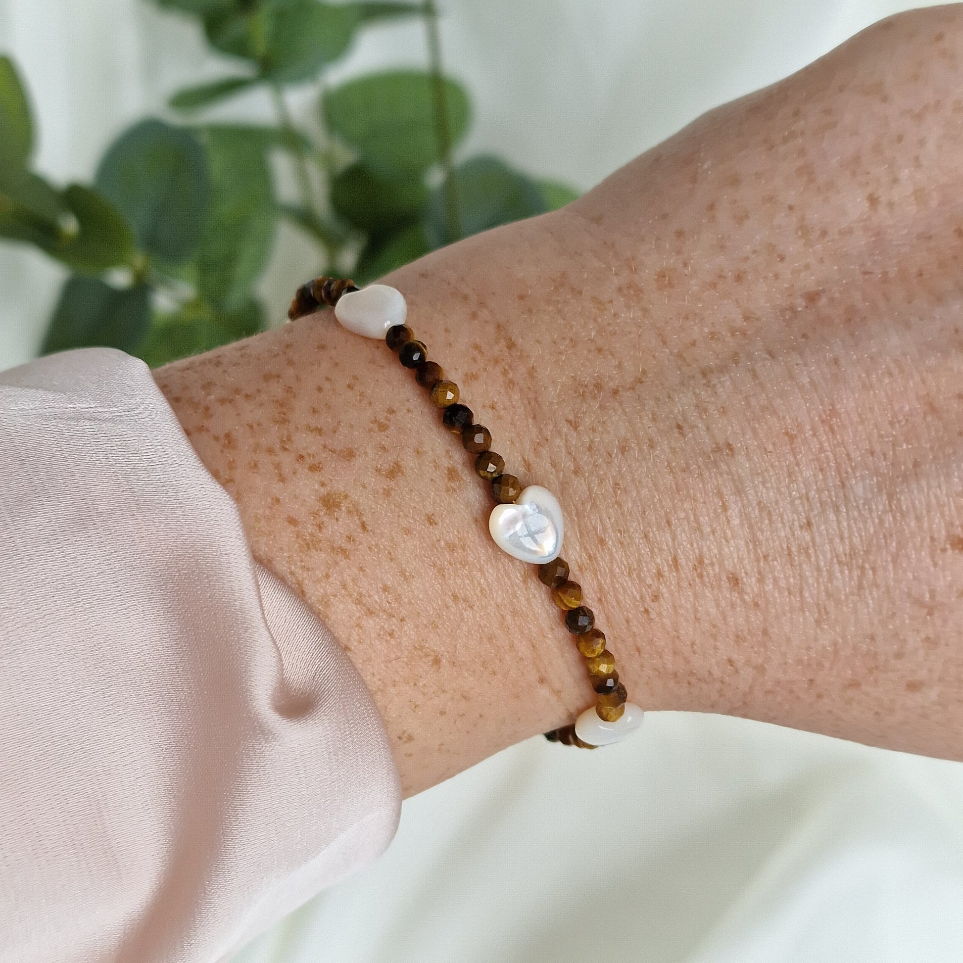 The Radiant Heart bracelet combines the grounding energy of tiger’s eye with the soft, loving glow of heart-shaped mother of pearl, creating a timeless piece that radiates confidence and calm. Handcrafted with gold-filled findings, this gemstone bracelet adds warmth and meaning to your everyday style - a reminder to lead with both strength and love.